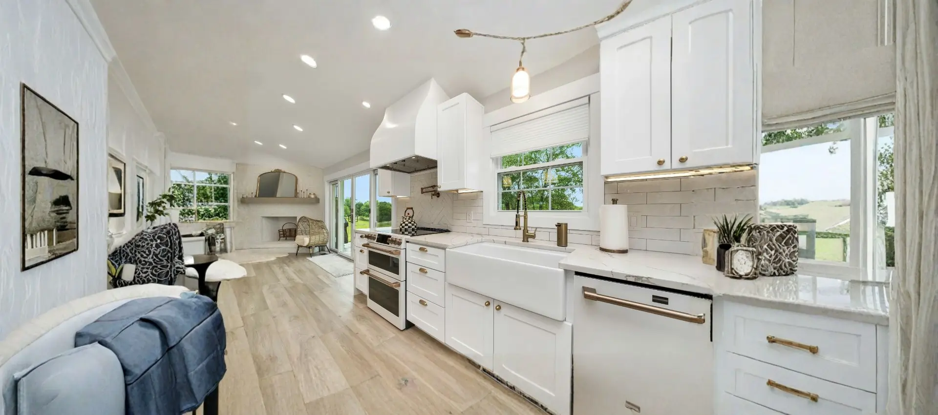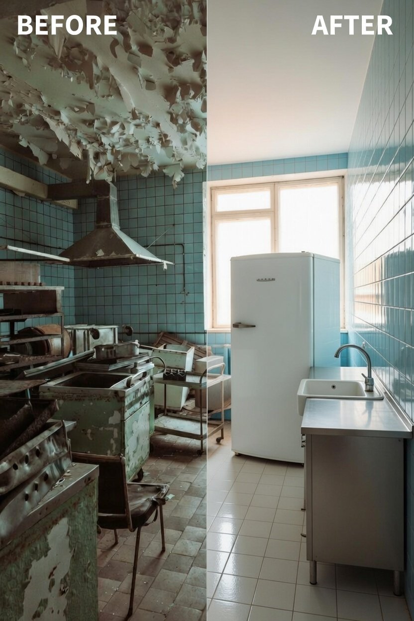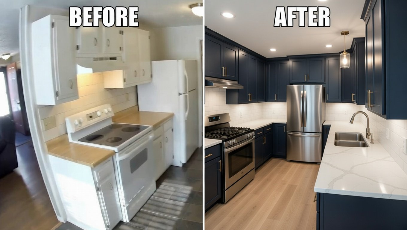 Complete kitchen renovation including layout redesign, cabinets, countertops, flooring, lighting.